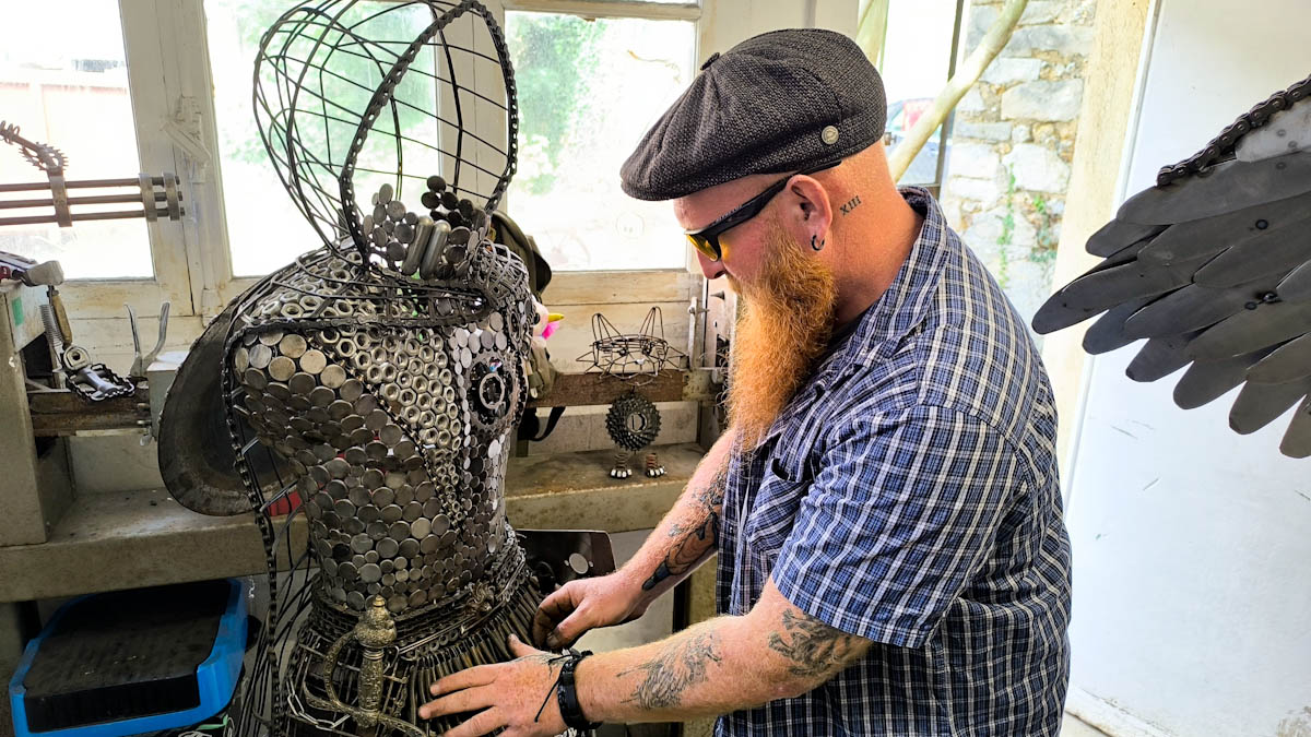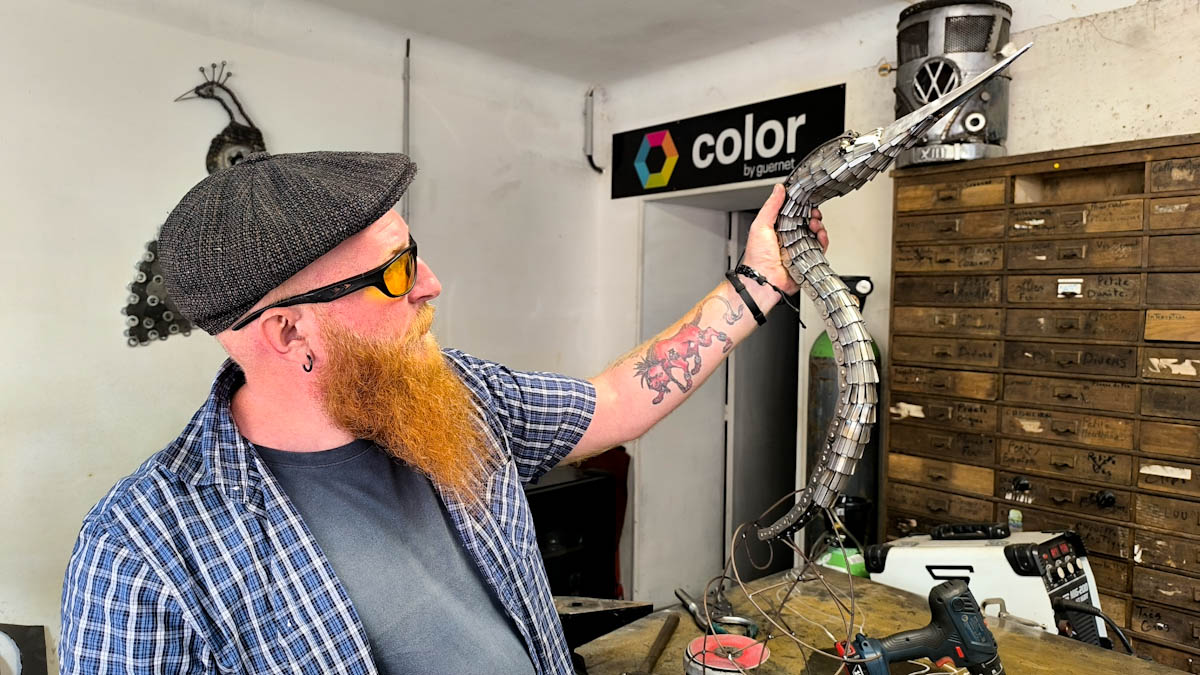 Au fil du temps, son atelier s’est rempli d’objets aussi variés qu’inattendus. Une structure inspirée des cultures celtiques transformée en meuble, des guitares entièrement métalliques, un impressionnant navire aux allures de légende, et plus récemment une caisse à savon, témoignent de cette diversité. Les animaux occupent également une place importante dans son travail, à l’image d’un gorille monumental qui lui a demandé de nombreux mois d’efforts.
